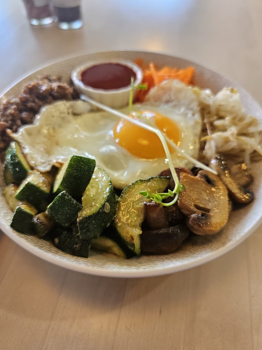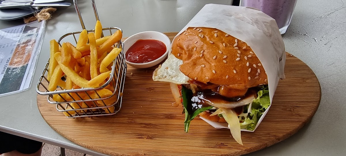 One of the highlights of the cafe's menu is the Bibimbap, a vibrant Korean dish that blends fresh vegetables, savory beef, and a fried egg, all tossed in a flavorful sauce. Whether you're craving something hearty for breakfast or looking for a wholesome meal during the day, the Bibimbap is a must-try. Another standout is the Oz Beef Burger with Chips - a juicy, tender beef patty paired with crispy chips, offering a satisfying bite that's hard to resist.