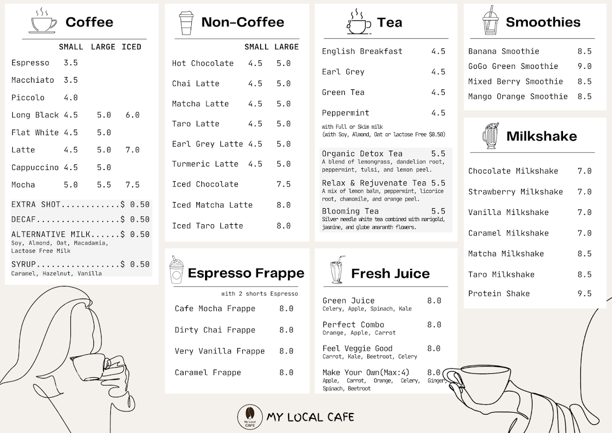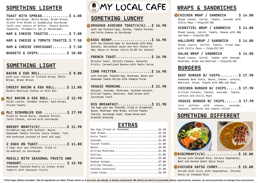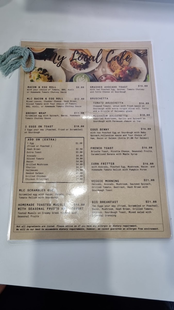 From a reviewer’s perspective, the menu at My Local Cafe blends comforting all‑day breakfast classics with heartier brunch options that deliver both variety and value. Diners can start simple with a Bacon & Egg Roll (around $9.90) or the more loaded MLC Bacon & Egg Roll (about $15.90), and there’s the satisfying Brekky Wrap (approximately $15.90) packed with spinach, scrambled egg, bacon and relish for a flavourful kick. Egg lovers will appreciate Two Eggs on Toast (around $13.90) or the indulgent MLC Scrambled Egg (about $19.50), while those after a more substantial brunch can choose the classic Big Breakfast (roughly $24.50) or the veggie‑forward Corn Fritter and Smashed Avocado Toast (each about $19.50) for a modern café twist. With this range of familiar favourites and creative options at clear price points, the menu feels both approachable and generous, making it easy to find something to suit almost any morning or midday appetite.